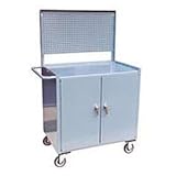 MOBILE ALL WELDED SERVICE BENCH Cabinet Workbench with Peg Board Keep Parts and Tools Readily Available These all welded mobile service benches are the answer to keeping tools and components organized. Heavy duty 12 gauge 36 x 24 work surface includes back and end stops to keep items from falling during transport. 14 gauge Pegboard Tool Organizer. These mobile work benches are perfect for industrial environments including garages, work shops, auto shops, warehouses and more. These industrial workbenches have a 1200 lb. capacity with scratch resistant gray baked enamel finish. The tubular handle on these mobile workbenches have a smooth radius bend for strength and easy maneuvering from site to site. Moves easily on 2 rigid, 2 swivel 5 polyurethane casters. Overall: 36W x 24D x 60H. Cabinet Workbenches have 14 gauge sides, a locking handle with 2 keys and 12 gauge doors.